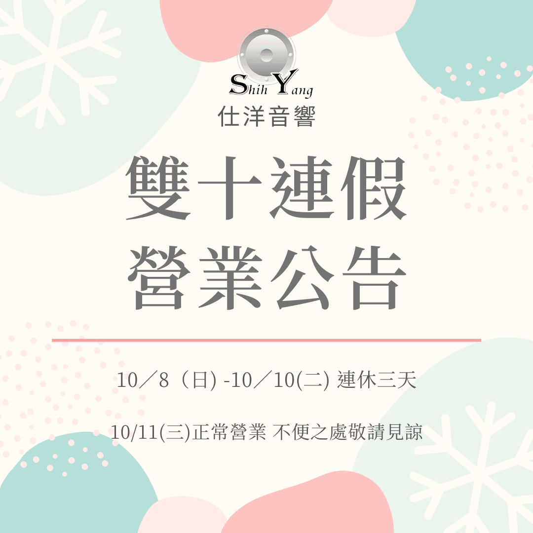 |雙十連假 | 營業公告 | 10/9(六) 門市正常營業 AM 11:00~PM 9:00 10/8(日)-10/10(二) 門市公休 暫停出貨 10/11(三) 正常營業 正常出貨 連假貨運配送量大 如延遲到貨 請見諒 造成不便 請多見諒 ! 預祝大家假期愉快 | 仕洋音響 | 門市地址:台北市中正區漢口街一段108號 | 預約電話:02-23811230 | 官方Line:@shinyang /https://lin.ee/Jb2wT9K