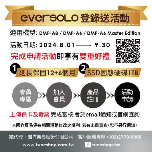 eversolo活動通知 好評不斷 DMP-A8 上網註冊申請送1tb SSD和12+6個月保固延長活動 另本次也再加碼DMP-A6,DMP-A6 Master 購買總代理國祥貿易公司貨,官網加入會員及註冊商品 參加『登錄送新品上市活動』,審核通過即享有雙重好禮 !! 好禮1 保固延長 12+6 個月 好禮2 SSD 固態硬碟 1TB 乙個 申請活動官網 https://www.tuneshop.com.tw/