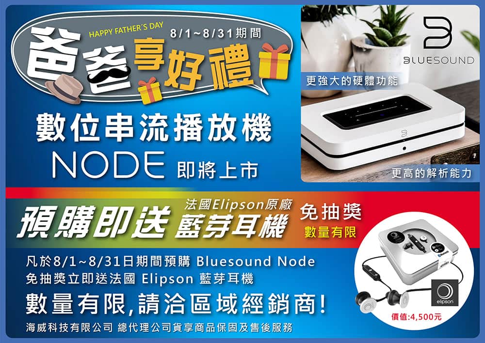 凡於 2021年8月1日~8月31日 期間預購 Bluesound NODE,免抽獎立即送法國 Elipson 藍芽耳機 (價值:4500元),數量有限,請洽仕洋音響。