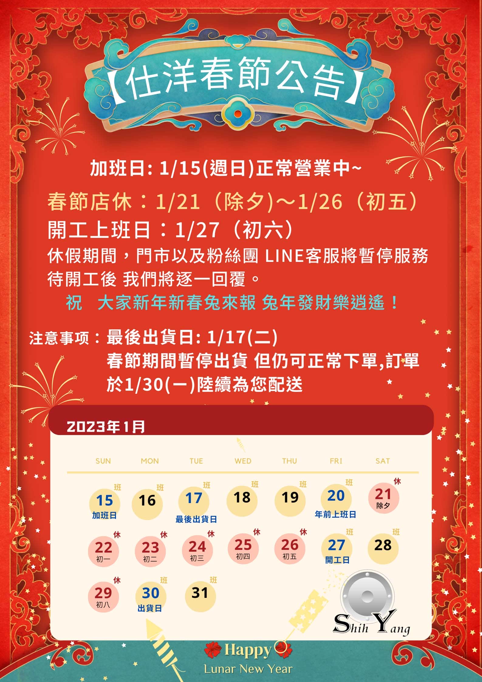 【春節休假公告】 兔年好運到,鴻兔大展一整年 一年一度的農曆春節即將到來囉!! 感謝各位朋友過去一年的照顧 加班日: 1/15(週日)正常營業中~ 春節店休:1/21(除夕)~1/26(初五) 開工上班日:1/27(初六) 休假期間,門市以及粉絲團 LINE客服將暫停服務 待開工後 我們將逐一回覆。 注意事项: 最後出貨日: 1/17(二) 春節期間暫停出貨 但仍可正常下單,訂單於1/30(ㄧ)陸續為您配送 祝 大家新年新春兔來報 兔年發財樂逍遙!