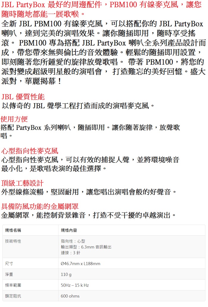 JBL PBM100 有線麥克風【英大公司貨保固】